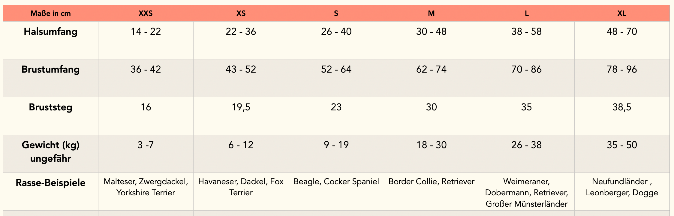 WICHTIG! Da die Geschirre nach Bestellung individuell angefertigt werden, sind diese von Rückgabe und Umtausch ausgeschlossen, deshalb ist es sehr wichtig, dass du deinen Hund korrekt ausmisst. Wie genau das geht, kannst du dir in der Messanleitung anschauen. Diese findest du hier.